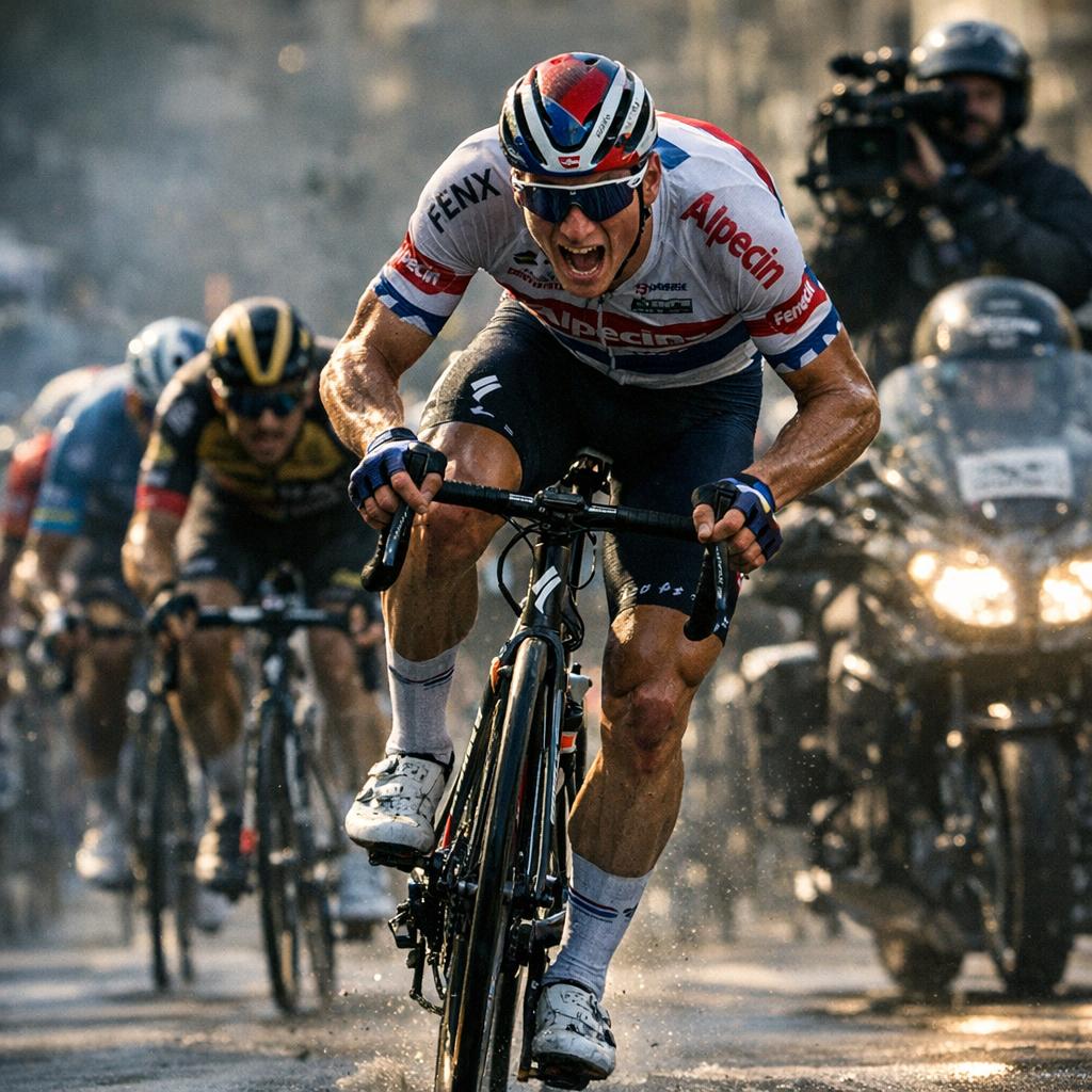 Van der Poel, in maglia ciclamino, ha corso di testa. Sapeva che Ganna avrebbe provato l’anticipo e che Visma avrebbe lanciato la volata per Van Aert. Non ha sprecato un watt prima del momento giusto. In una tappa dura, con ritmo alto fin dal mattino e fuga combattiva, ha trasformato un finale tecnico in un’esibizione di timing e potenza.