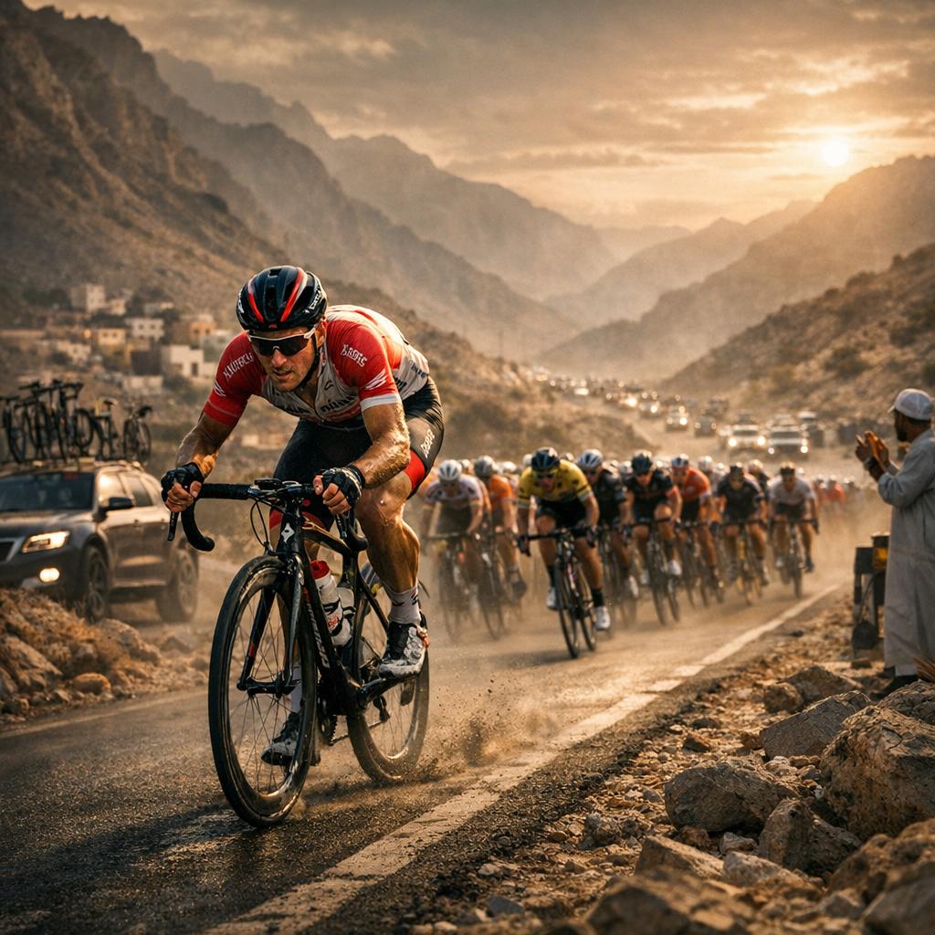 Il punto di svolta arriva sull’Al Hamriyah, breve ma secco, a circa 10 chilometri dall’arrivo. Dal gruppo partono gli scatti: Paul Double anima l’azione, Adam Yates rilancia, il gruppo accelera e il distacco inizia a scendere rapidamente. È qui che Veistroffer fa la differenza. Mentre i compagni di fuga finiscono fuori giri, lui cambia passo sulla cresta della salita e scollina da solo. Non è uno scatto violento, è un rilancio secco, fatto di rapporto giusto e cadenza alta, quando gli altri hanno già acido nelle gambe.